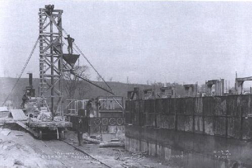 To facilitate the erection of such an innovative compound, a “concreting train” was employed to haul building materials and equipment to the site. The train caught the attention of Coal Age, which described how sand, cement, and cinders were delivered to the area.