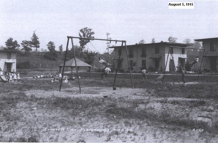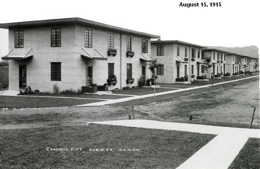 Another innovation used at Concrete City was a “concreting train”. As the site was cleared and grade, a railroad track was laid around the rectangular area and building materials were hauled in by train. A writer for Coal Age observed that “a mixing plant was mounted upon a flat car with an elevator for hoisting concrete attached. Cars of sand, cement and cinders were attached to the mixing car, and the concrete was hoisted from the mixer to an elevated hopper, from which spouts conducted the mixture into steel forms at various parts of the building.” When the concrete of each level hardened sufficiently, workmen hoisted the pre-constructed forms to the next level and the train progressed to the next structure and poured another belt of concrete. The procedure was repeated until the house was completed.